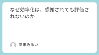 効率化の正体なぜ効率化は、感謝されても評価されないのか 「〇〇さんのおかげで、本当に助かったよ!ありがとう」同僚や上司からのそんな感謝の言葉。最初は嬉しくて、「もっとみんなを楽にしよう」「無駄な業務を削ろう」と、一生懸命に改善を繰り返してきたはずです。マニュアルを作ったり、複雑なExcelファイ... 2026.02.07効率化の正体