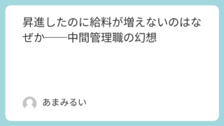 効率化の正体昇進したのに給料が増えないのはなぜか──中間管理職の幻想 僕は昇進が決まったあの日、ようやくこれまでの努力が報われるのだと確信していました。勤続約10年、現場の効率化を誰よりも進め、成果も出し続けてきた自覚があったからです。ようやく年収も上がり、住宅ローンの繰り上げ返済や、子どもの習い事にもう少し... 2026.02.11効率化の正体